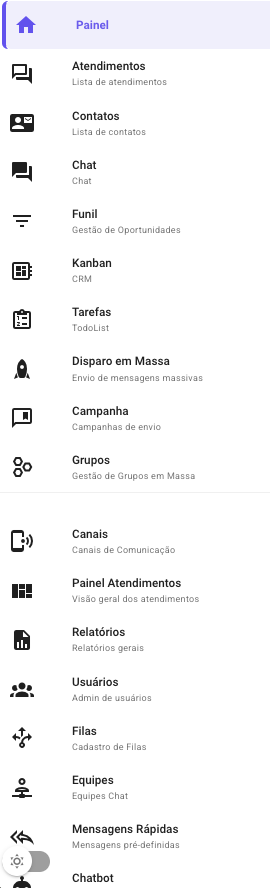 - Gestão de Canais: Conectar números de WhatsApp, contas de Instagram, etc.